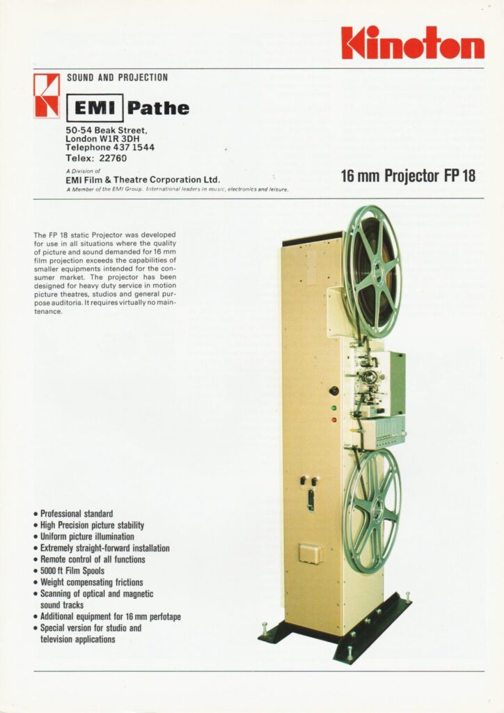 Specification and information sheet for the Kinoton 16mm FP 18 projector.