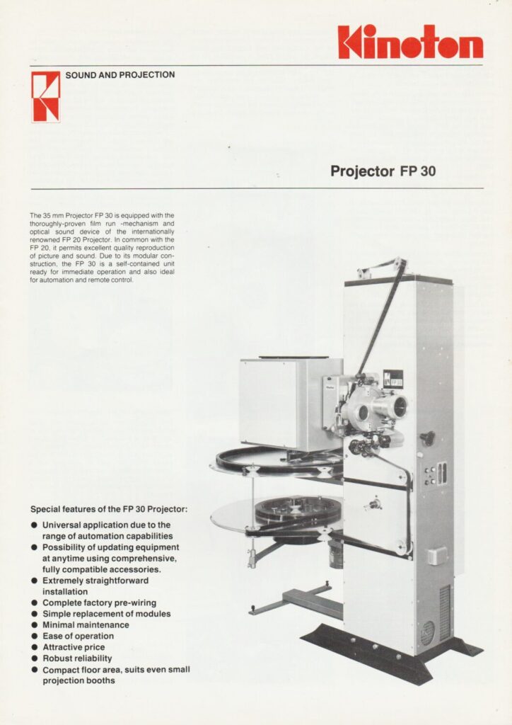 Information sheet on the Kinoton FP 30 projector, including optional extras.