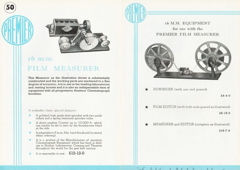 Information and price sheet for the film measurer by Premier.