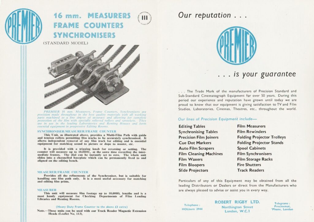 Information sheet on film measurers, counters and syncrhonisers for 16mm film from Premier.