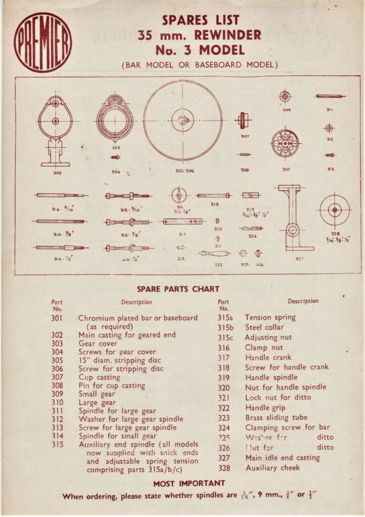 A spares list for the Premier No. 3 model rewinder, and 16mm rewinder.