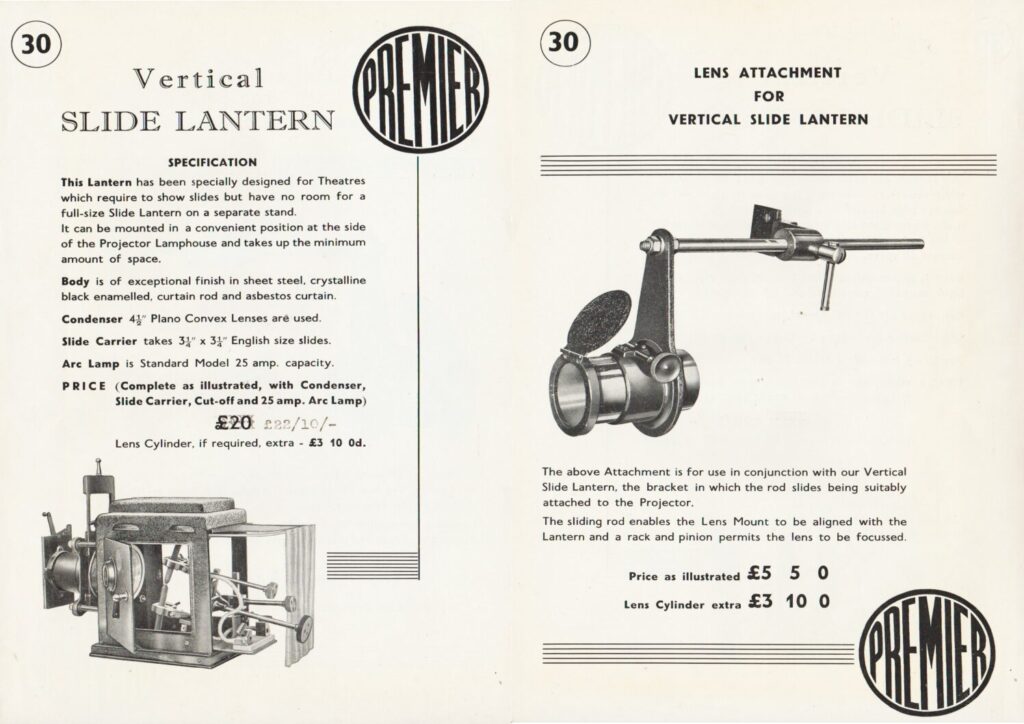 Price sheet for a slide lantern and lens attachment by Premier